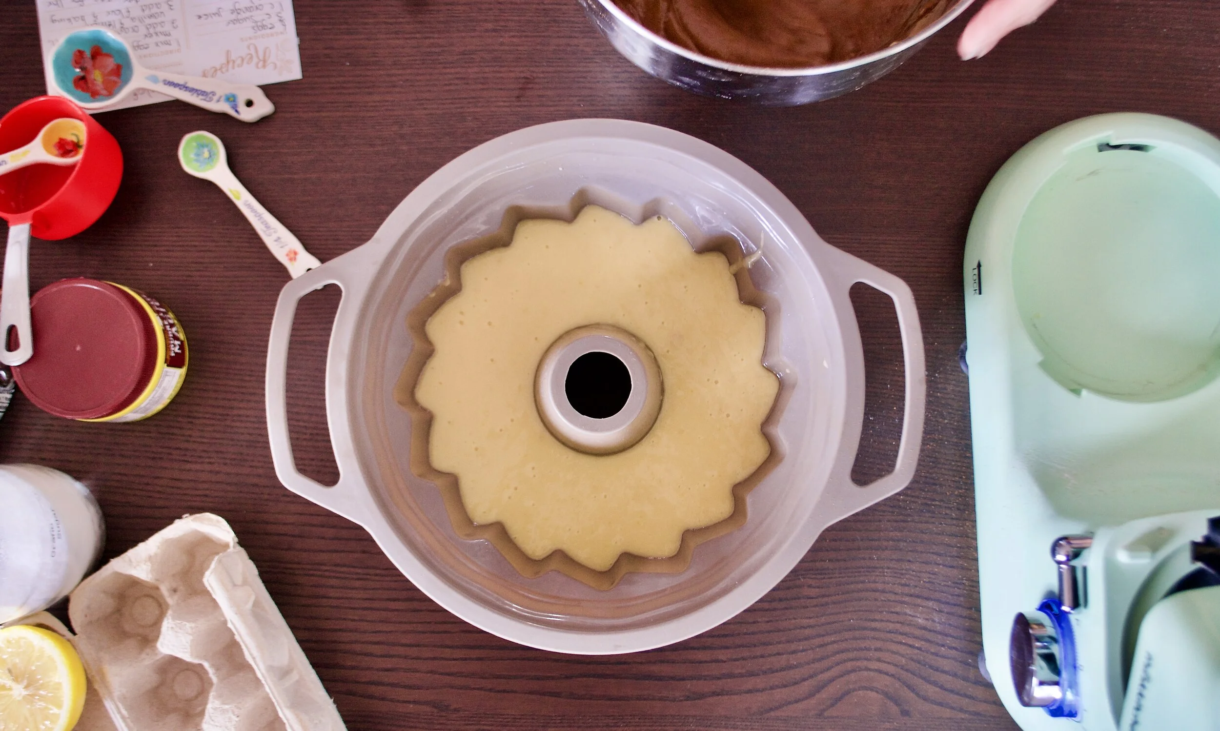 Grease and flour a bundt pan and add batter. Pour the batter with the cocoa on top and swirl with a knife